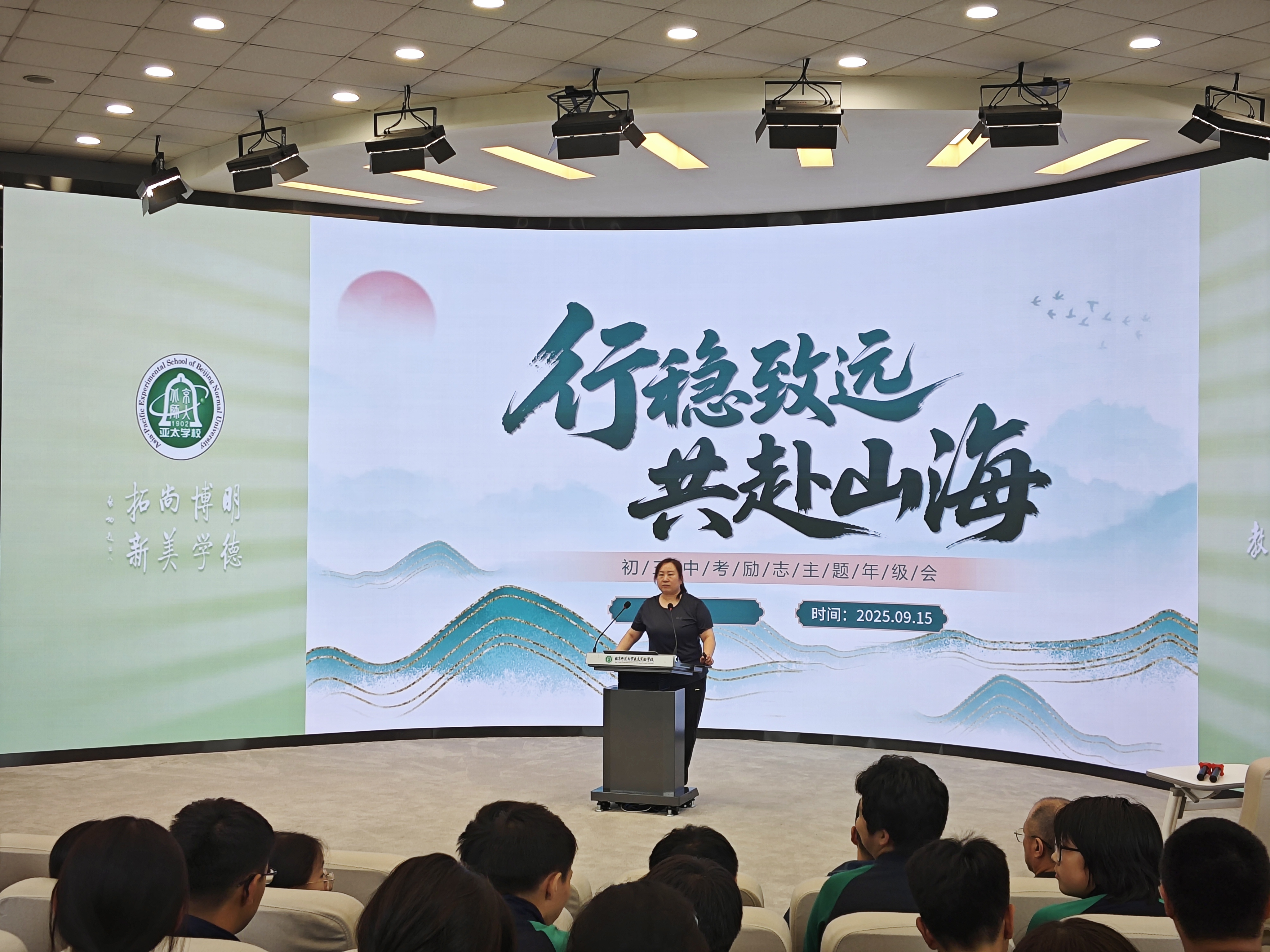2025年9 月 15 日,九年级“行稳致远,共赴山海”学考励志年级会举行,年级主任刘亚坤主持,全体师生参会,为学子明确备考方向、凝聚奋斗力量。