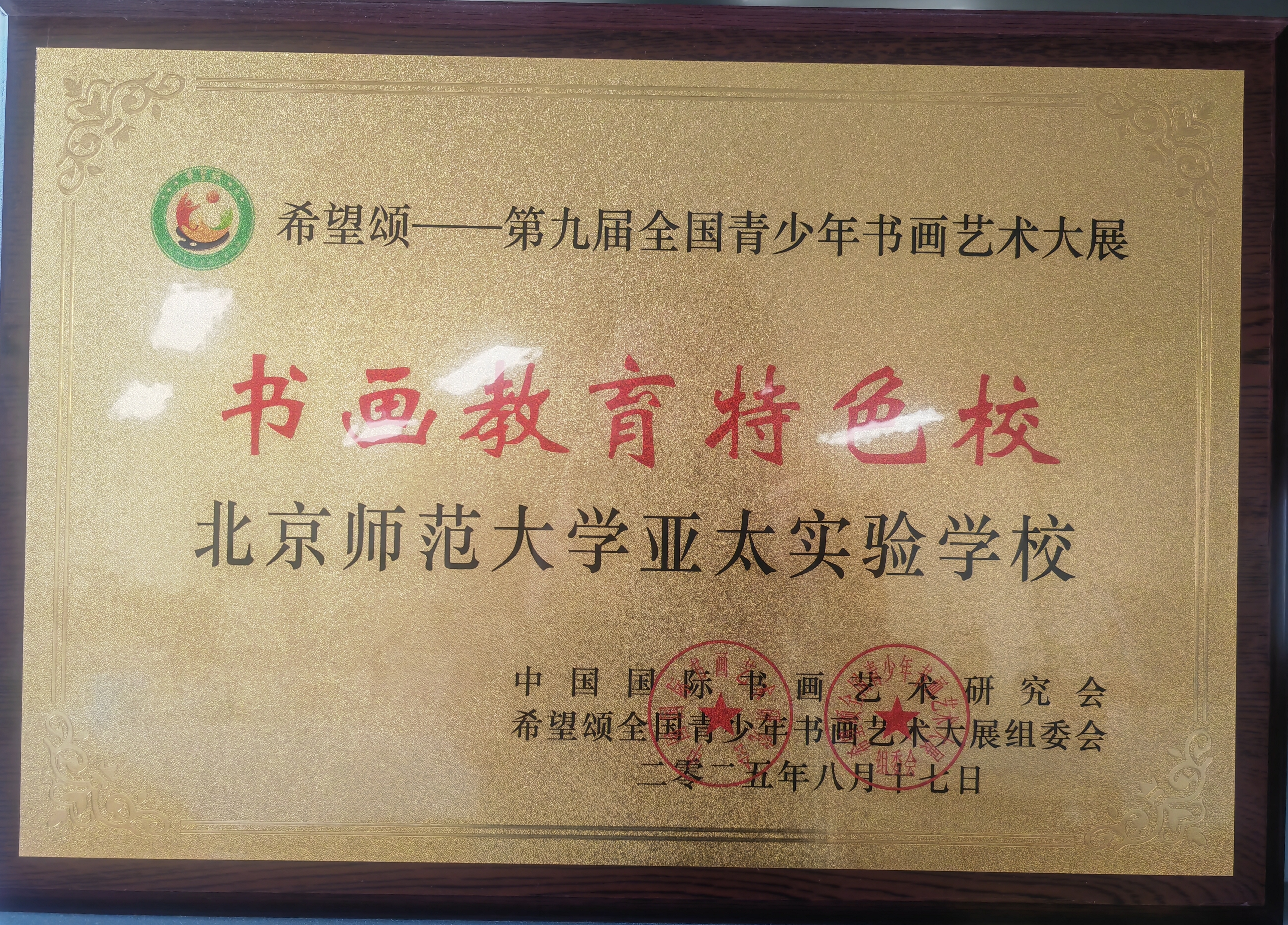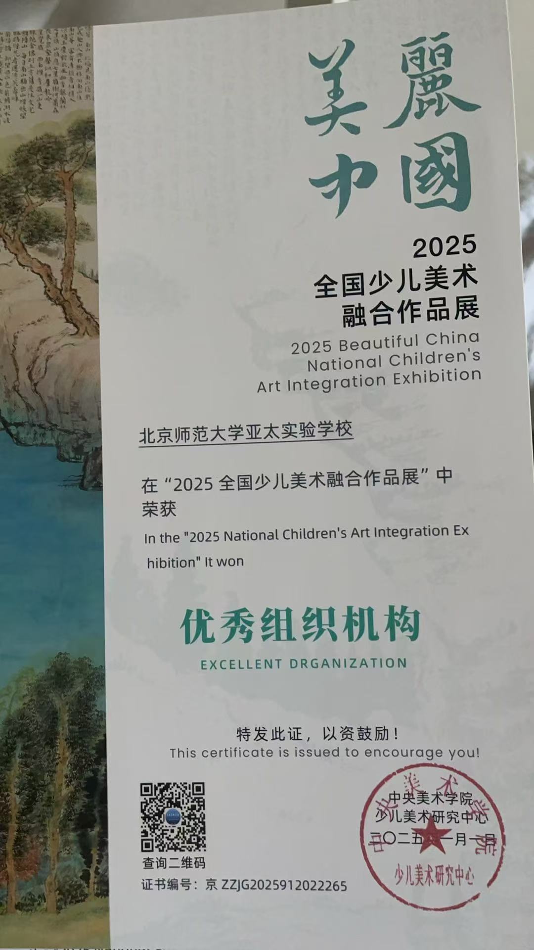 美育工作的扎实推进换来了诸多荣誉。学校先后荣获“2025美丽中国全国少儿美术融合作品展”优秀组织机构奖、第九届“希望颂”全国青少年书画艺术大展书画教育特色奖,7位美术教师在第14届西城区中小学生“我的北京我的家”等活动中获评优秀指导教师。