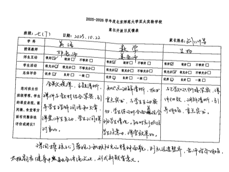 2025年10月22日上午,北京师范大学亚太实验学校七年级家长开放日如期举行,40余位家长受邀参与,沉浸式体验学校教育教学全貌。活动覆盖七年级12个教学班、30余名教师,60余节常态课全面开放,以“开放、互动、共融”理念搭建家校协同育人桥梁,获家长高度认可。