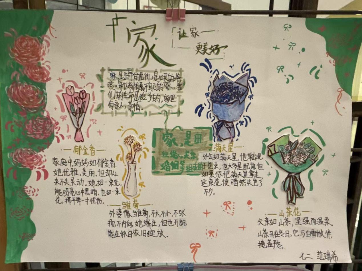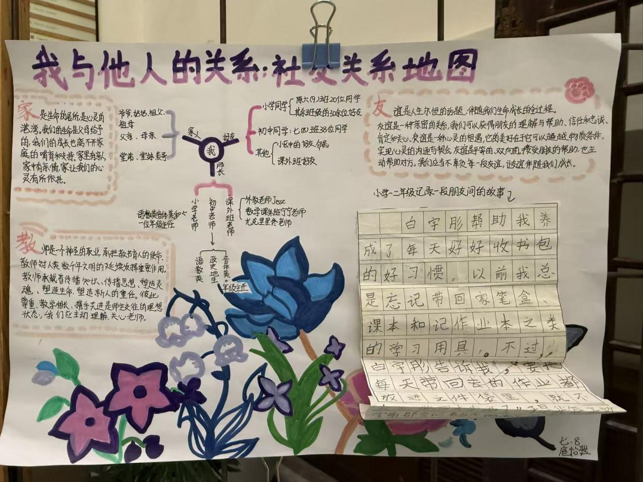 活动中,同学们以亲子情、师生谊、同窗伴、自我成长为核心主题,融合生活体验与学科知识创作。有的用漫画还原与父母和解瞬间,诠释亲情价值;有的以书信致敬师长,践行交往智慧;有的用思维导图梳理人际关系变迁,呼应“时空里的关系演进”。作品版面新颖、内容鲜活,尽显学科功底与成长感悟。