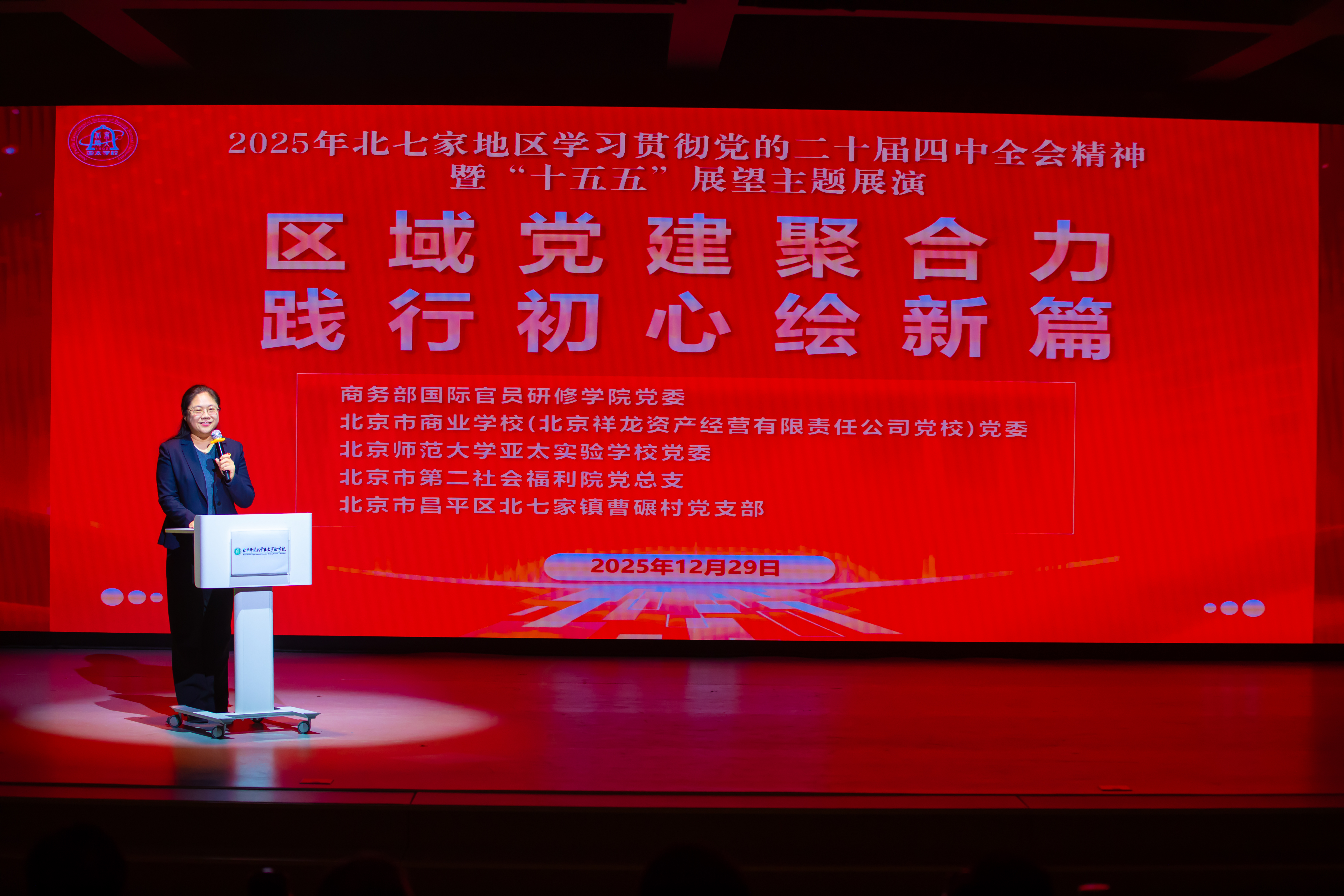 为深入学习贯彻党的二十届四中全会精神,展望“十五五”发展蓝图,凝聚区域奋进力量,2025年12月29日,由北京师范大学亚太实验学校党委、商务部国际商务官员研修学院党委、北京市商业学校(北京祥龙资产经营有限责任公司党校)党委、北京市第二社会福利院党总支、北京市昌平区北七家镇曹碾村党支部联合主办的“区域党建聚合力 践行初心绘新篇”主题展演活动在我校隆重举行。商务部国际商务官员研修学院党委书记、院长吴彬,北京市商业学校(北京祥龙资产经营有限责任公司党校)党委书记邢连欣、党委副书记李光勤,北京师范大学亚太实验学校党委书记、校长徐向东,北京市第二社会福利院党总支书记、院长王春梅,北七家镇曹碾村党支部书记王茂胜等领导及各主办单位师生代表、社区工作者共聚一堂,以艺术化形式让党的创新理论深入人心,共同凝聚高质量发展共识。