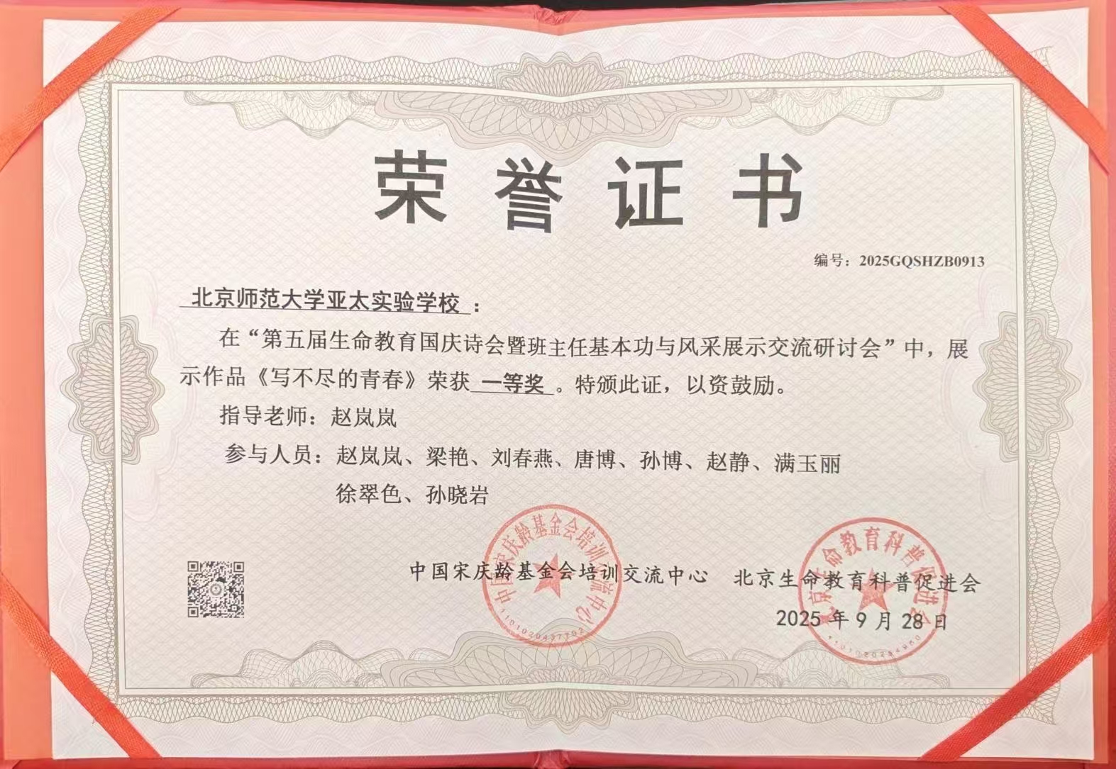 近日,由宋庆龄基金会培训交流中心与北京生命教育科普促进会联合主办的“第五届生命教育国庆诗会暨班主任基本功与风采展示交流研讨会”圆满落幕。我校教师团队表现亮眼,由赵岚岚老师指导,赵岚岚、梁艳、刘春燕、唐博、孙博、赵静、满玉丽、徐翠色、孙晓岩共同创作的作品《写不尽的青春》,凭借深刻的生命教育内涵与精湛的创作水准,在众多参赛作品中脱颖而出,最终斩获一等奖。